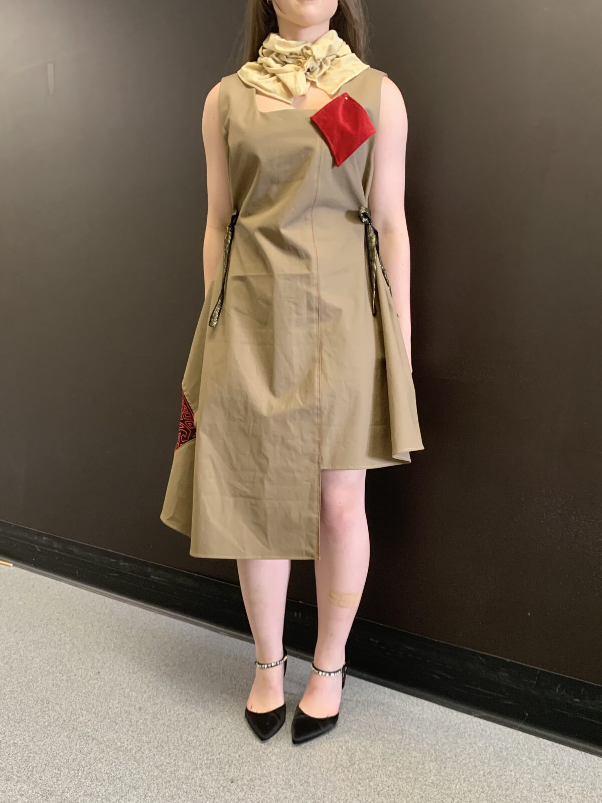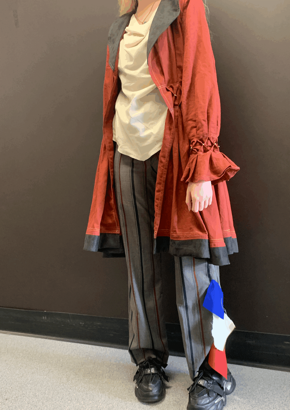This silhouette represents the king in the playing cards hierarchy. It features a commanding and elegant image, with a sense of luxury. The coat implemented the diamond-like smocking with gold beading on top, linking to the diamond suits. Additionally, this silhouette also added vibrant and bold colours to balance the dark colours, through multiple topstitches and flowing diamond shape fabric attachments.