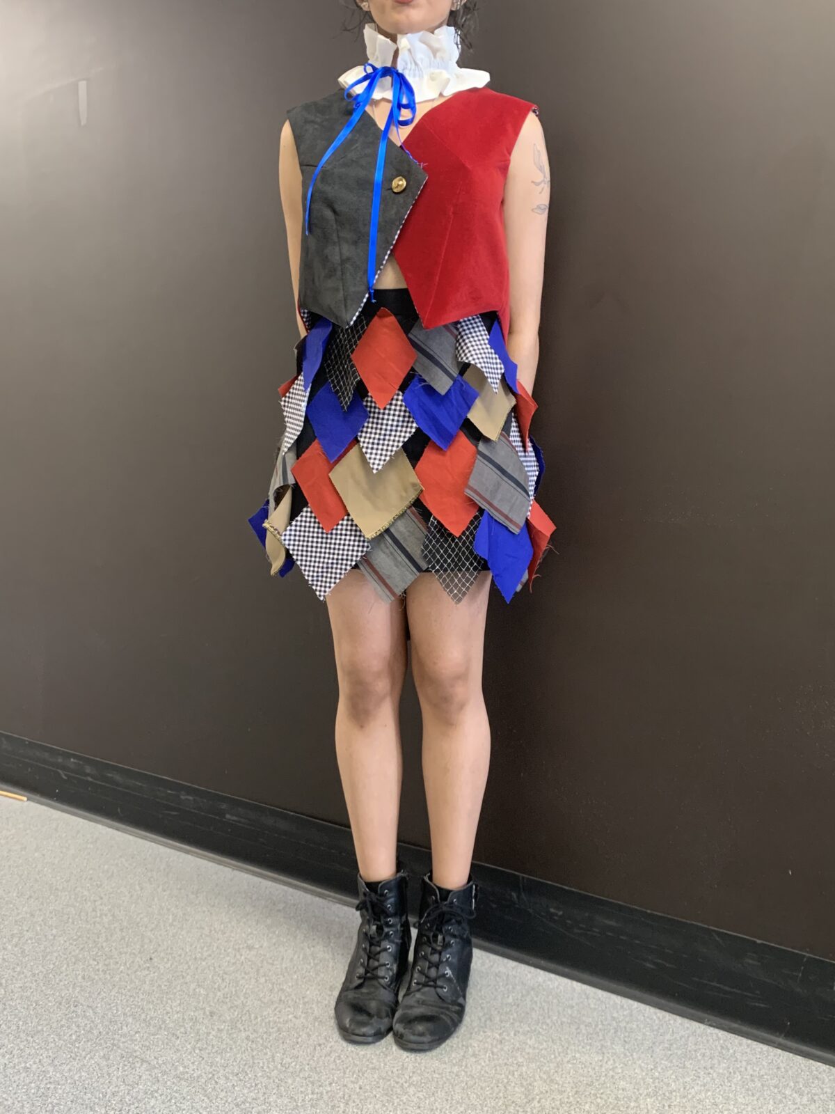 This silhouette represents the ace in the diamond suits. It depicts a smart and ambitious image. This silhouette implemented layered diamond fabric attachments in multiple colours and prints to present a playful and interesting aesthetic.
