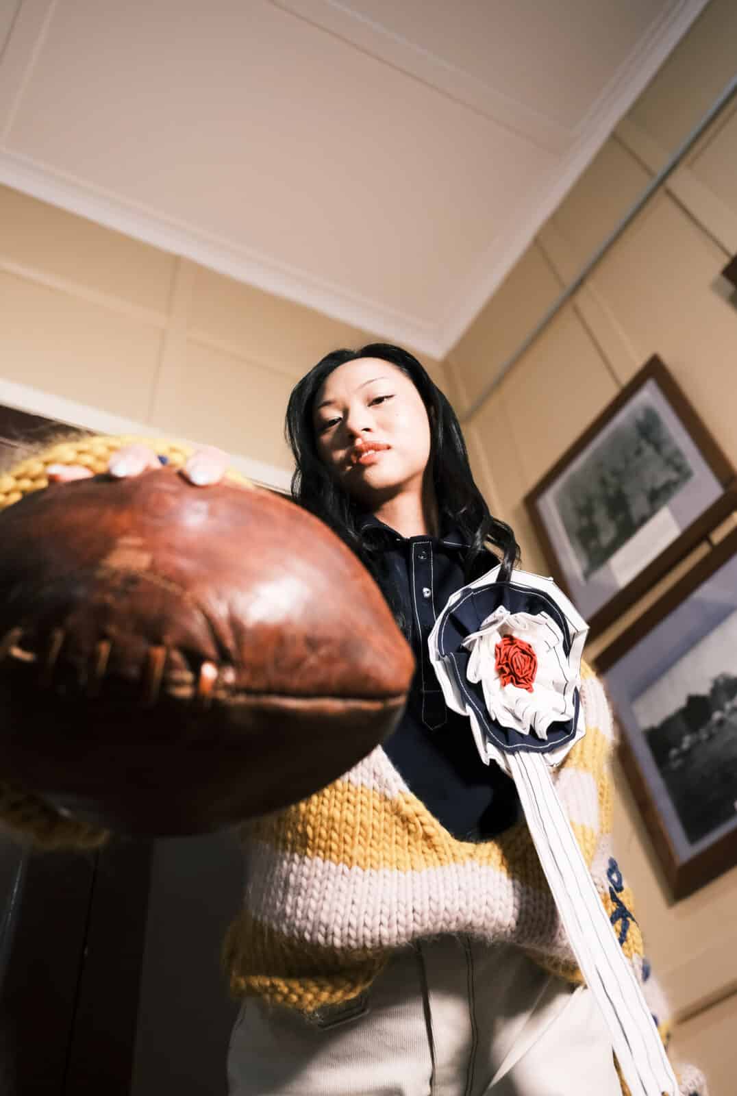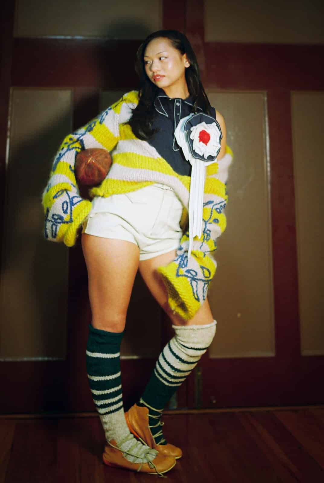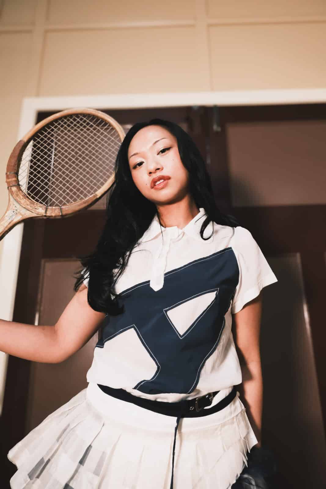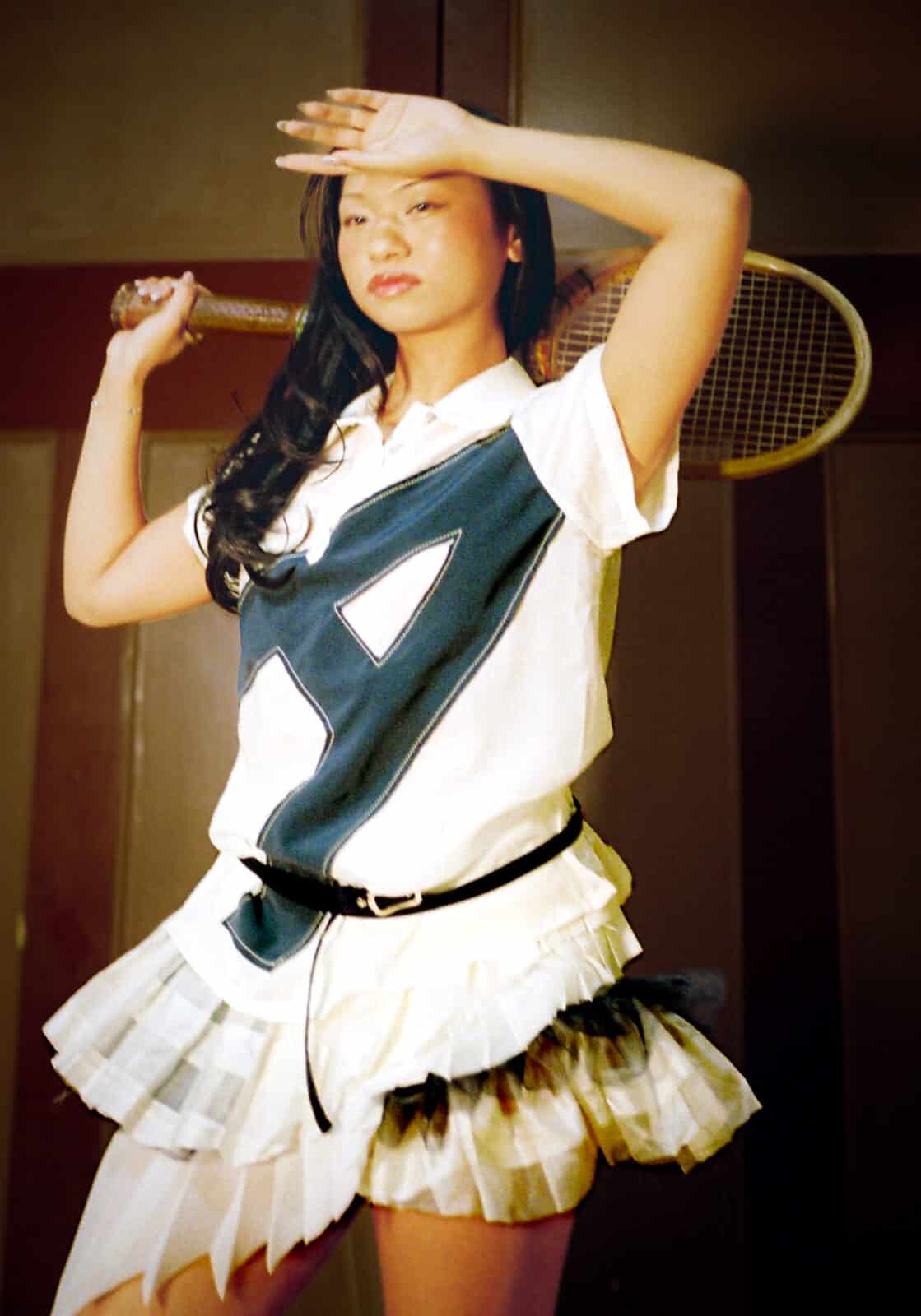 Modern tennis dress emerged as women rejected garments designed to restrict their bodies. This look references the period when Australian players could represent the nation only with a single “A”, a scarlet letter of limitation – reframed as a mark of defiance.