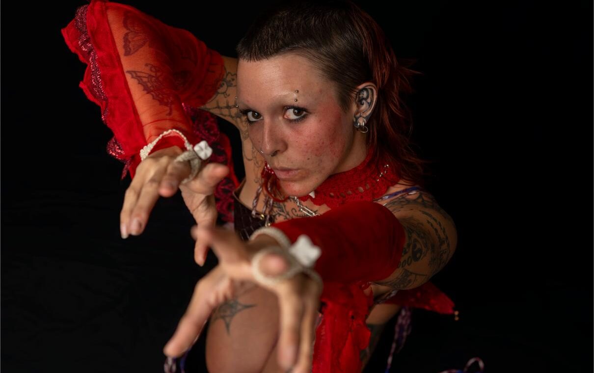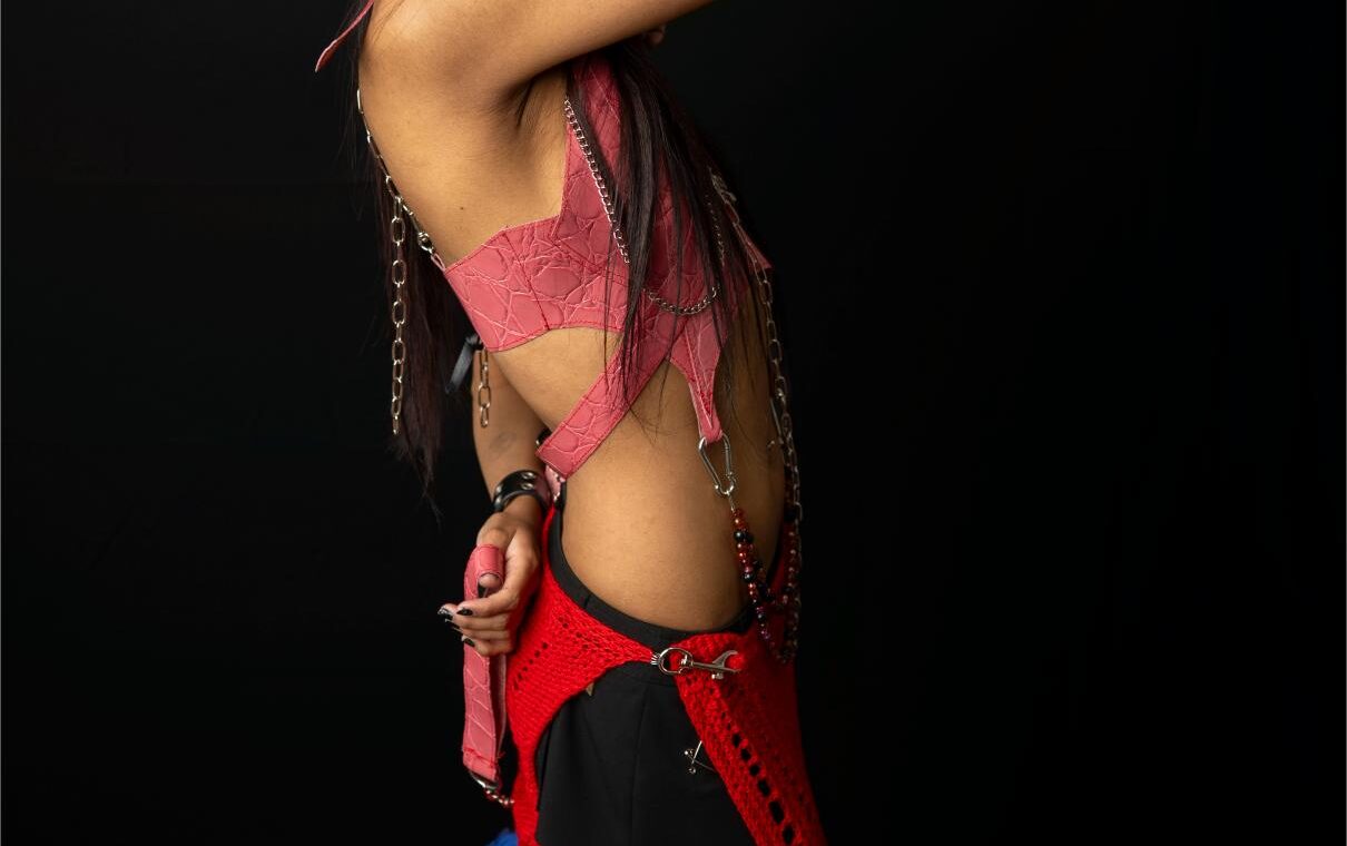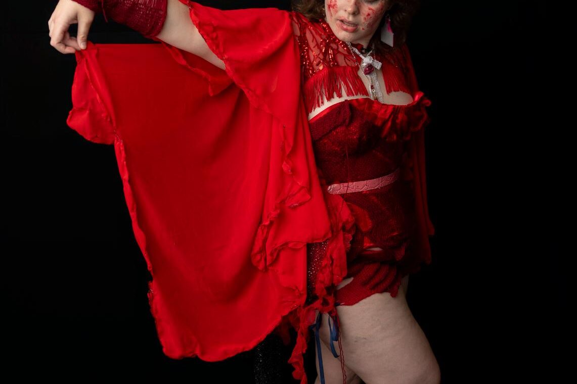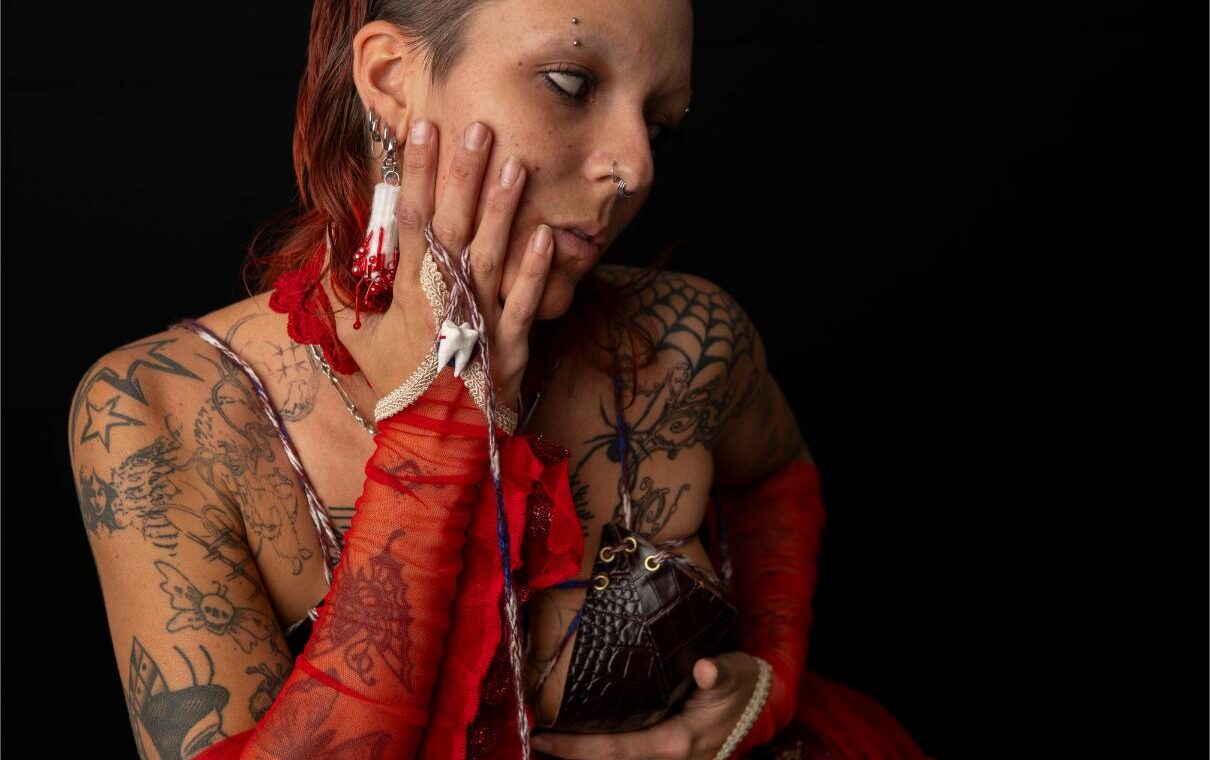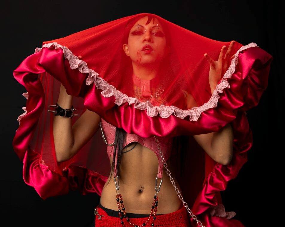 Nikhita AKA Gore Whore, is a Meanjin based fashion designer and visual artist. Their designs explore topics such as feminism and the brutality of being AFAB, explored through sustainable and recycled materials. They seek to bridge the gap between fashion and visual art.