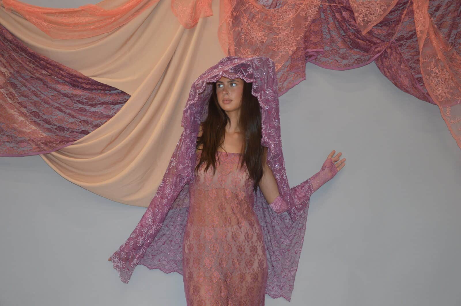 Silhouette #2: The ‘Rana’ Dress, paired with the ‘Zakiyah’ Gloves and ‘Immi’ Headpiece, embodies grace, intimacy, and the strength of feminine connection. Crafted entirely from lace, each element explores a different expression of texture within a unified burgundy palette. The ‘Rana’ Dress and ‘Zakiyah’ Gloves, made from lighter pink-toned lace, exude softness and romantic delicacy, while the beaded ‘Immi’ Headpiece — named after the Arabic word for mother — anchors the look in depth and devotion with its darker, richer tone.