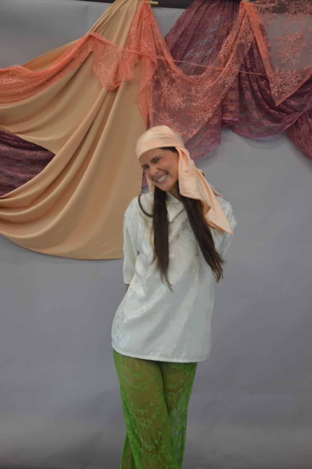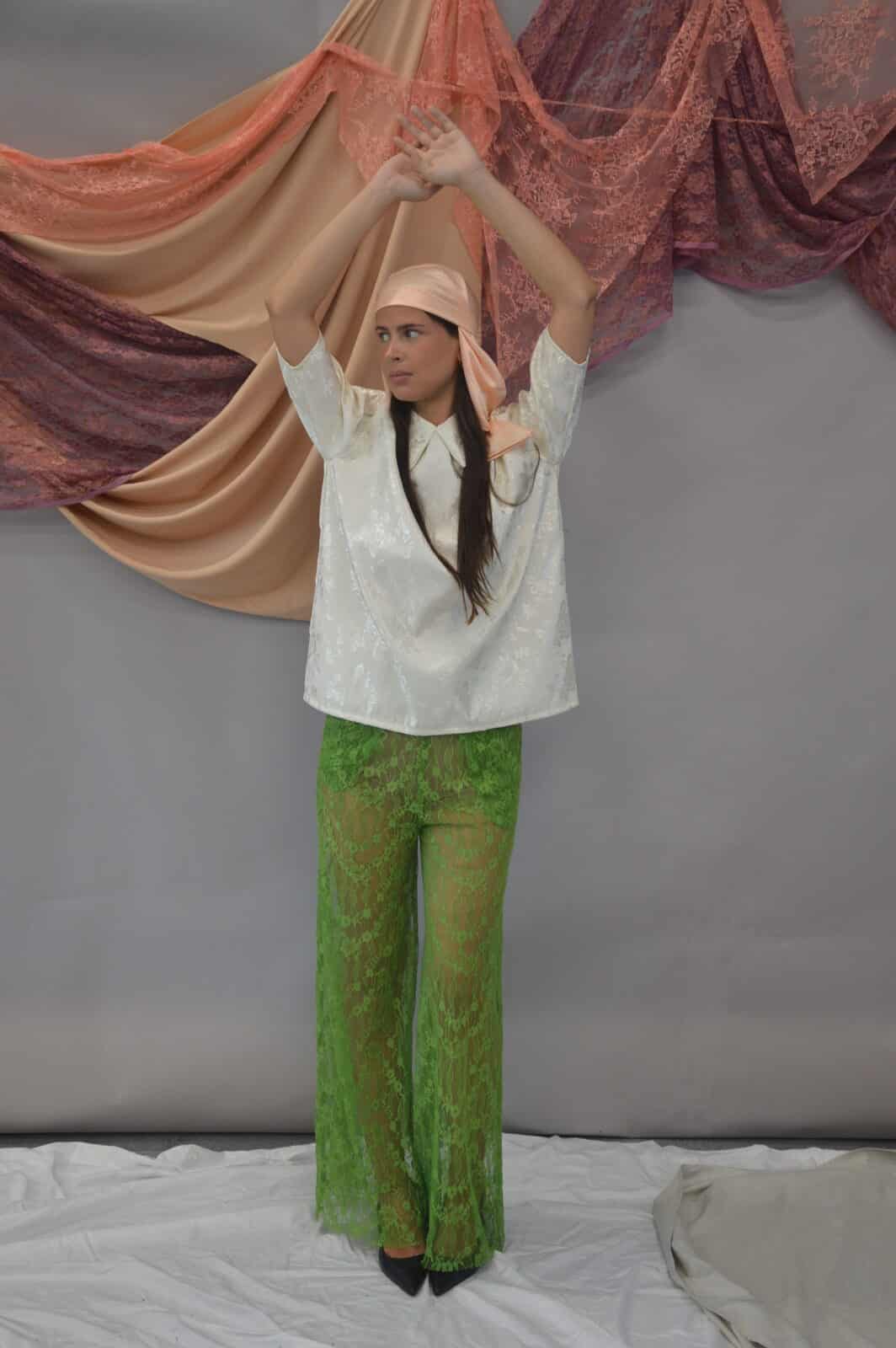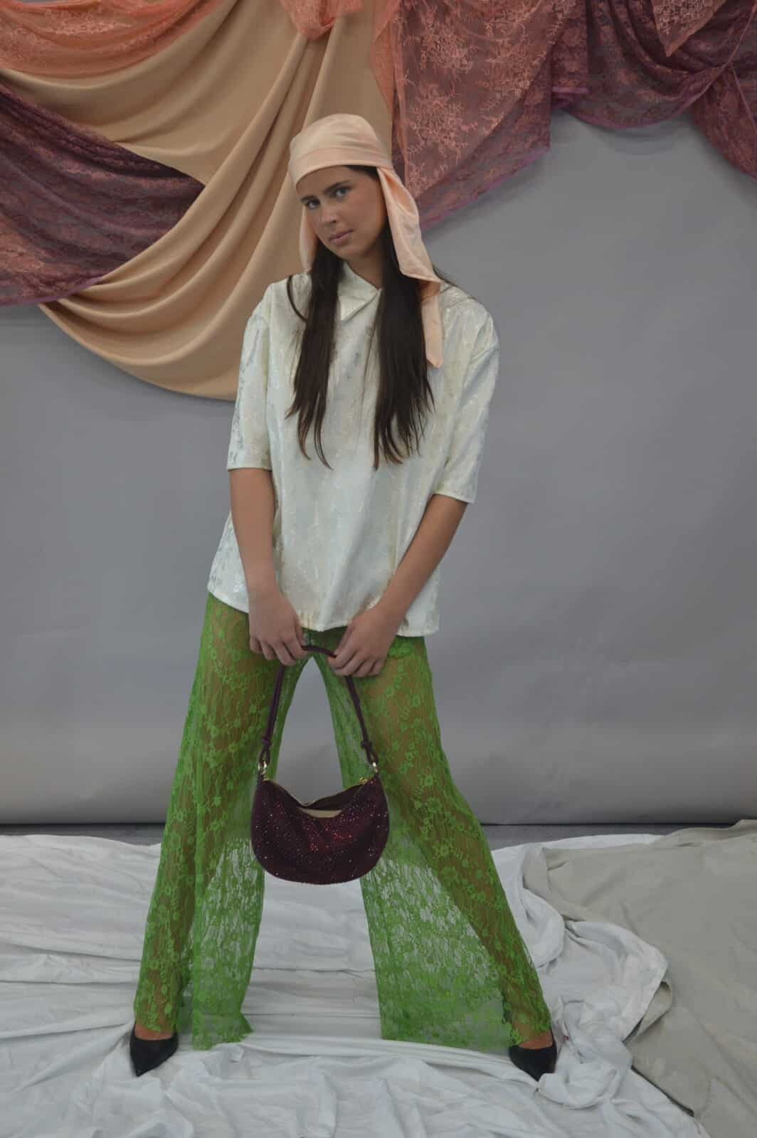 Silhouette #3: This look embodies contemporary modest elegance through the pairing of the ‘Marco’ top, ‘Jana’ headscarf, and ‘Iman’ pants. Crafted from printed satin, lace, and satin, the ensemble reflects a harmony between refinement and ease. The printed satin top introduces vibrancy and individuality, contrasted by the softness of lace accents that echo femininity and delicacy. Flowy lace pants ground the look in quiet sophistication, while the headscarf ties the elements together with grace and intention.