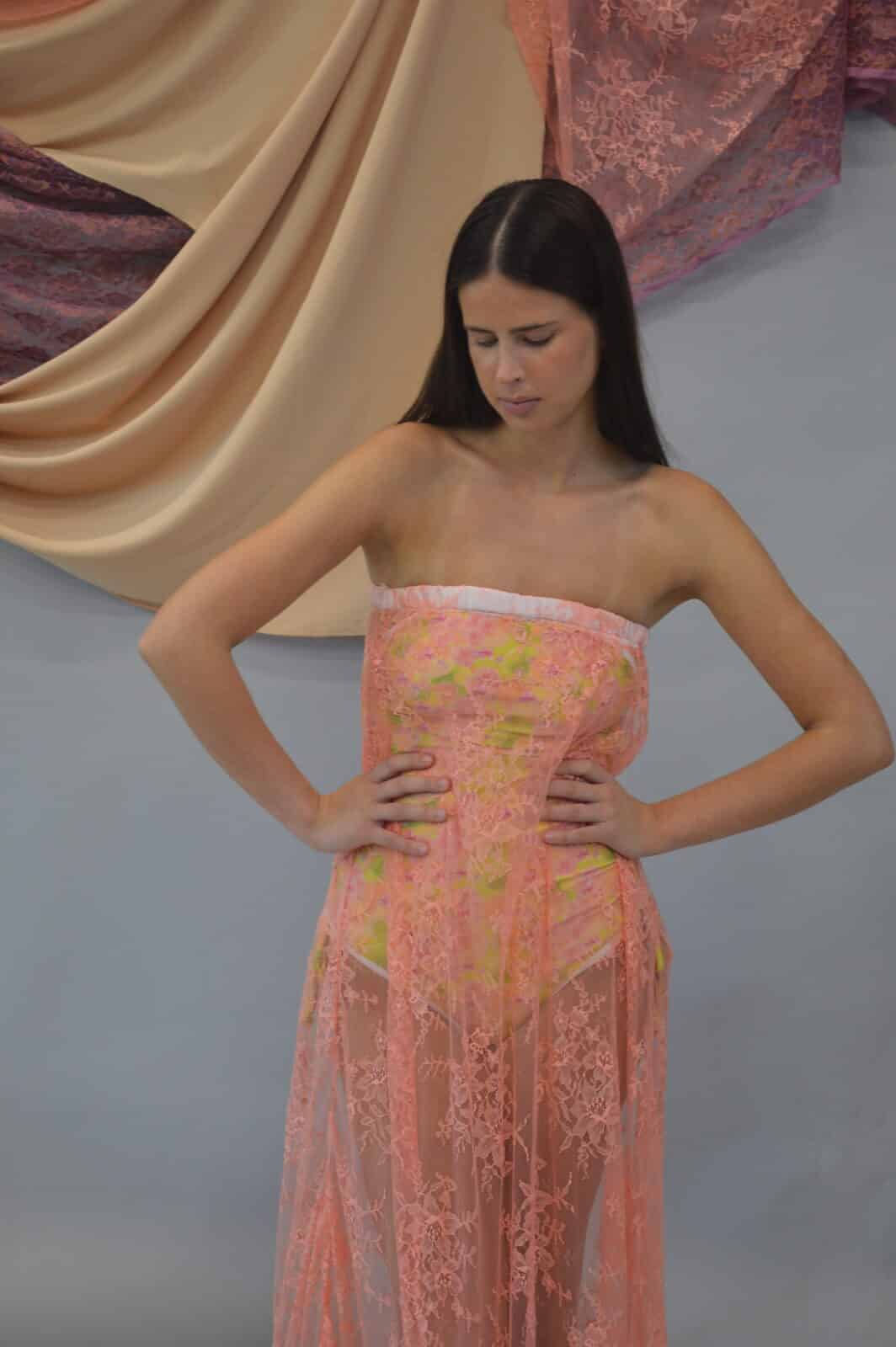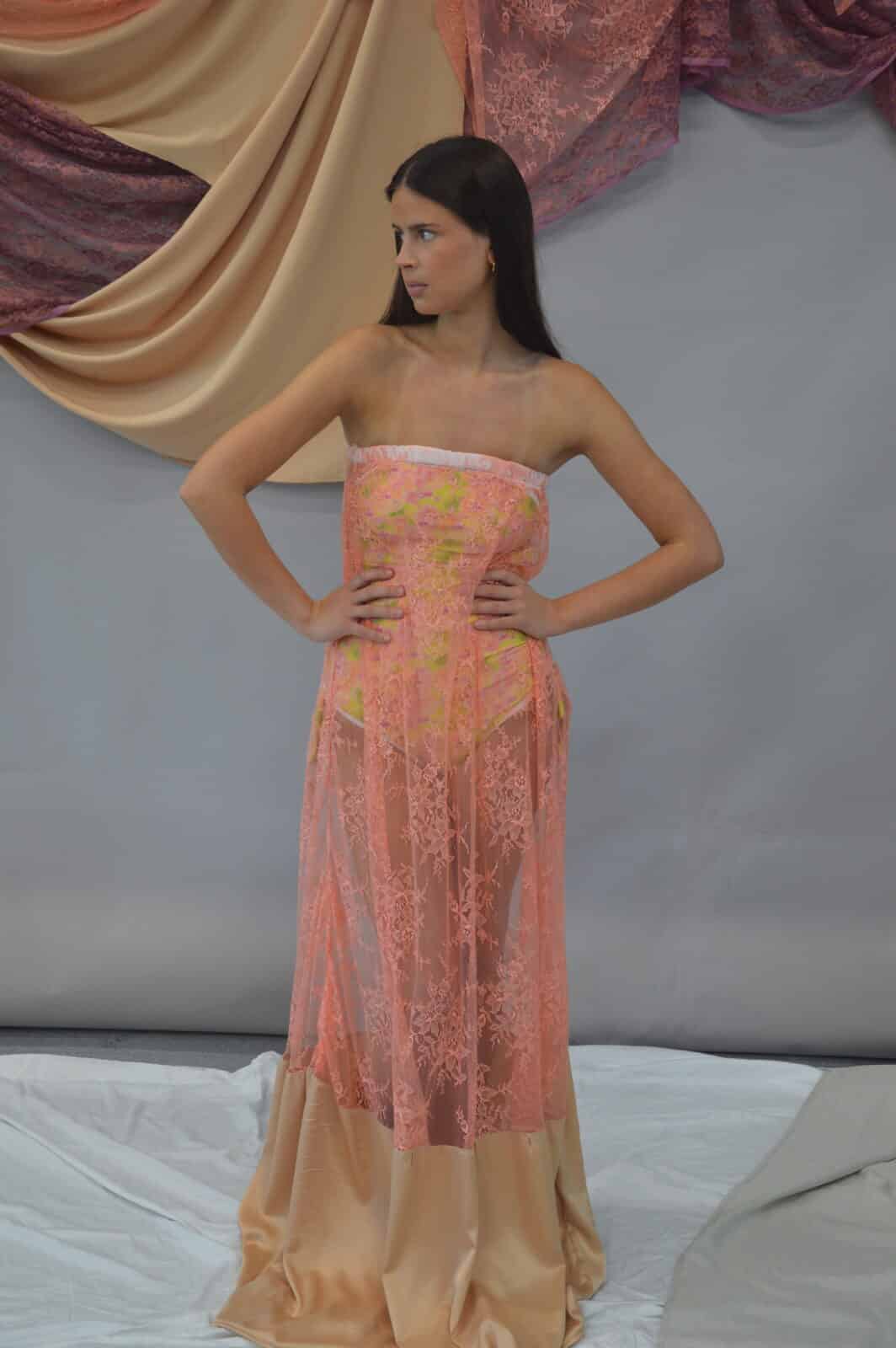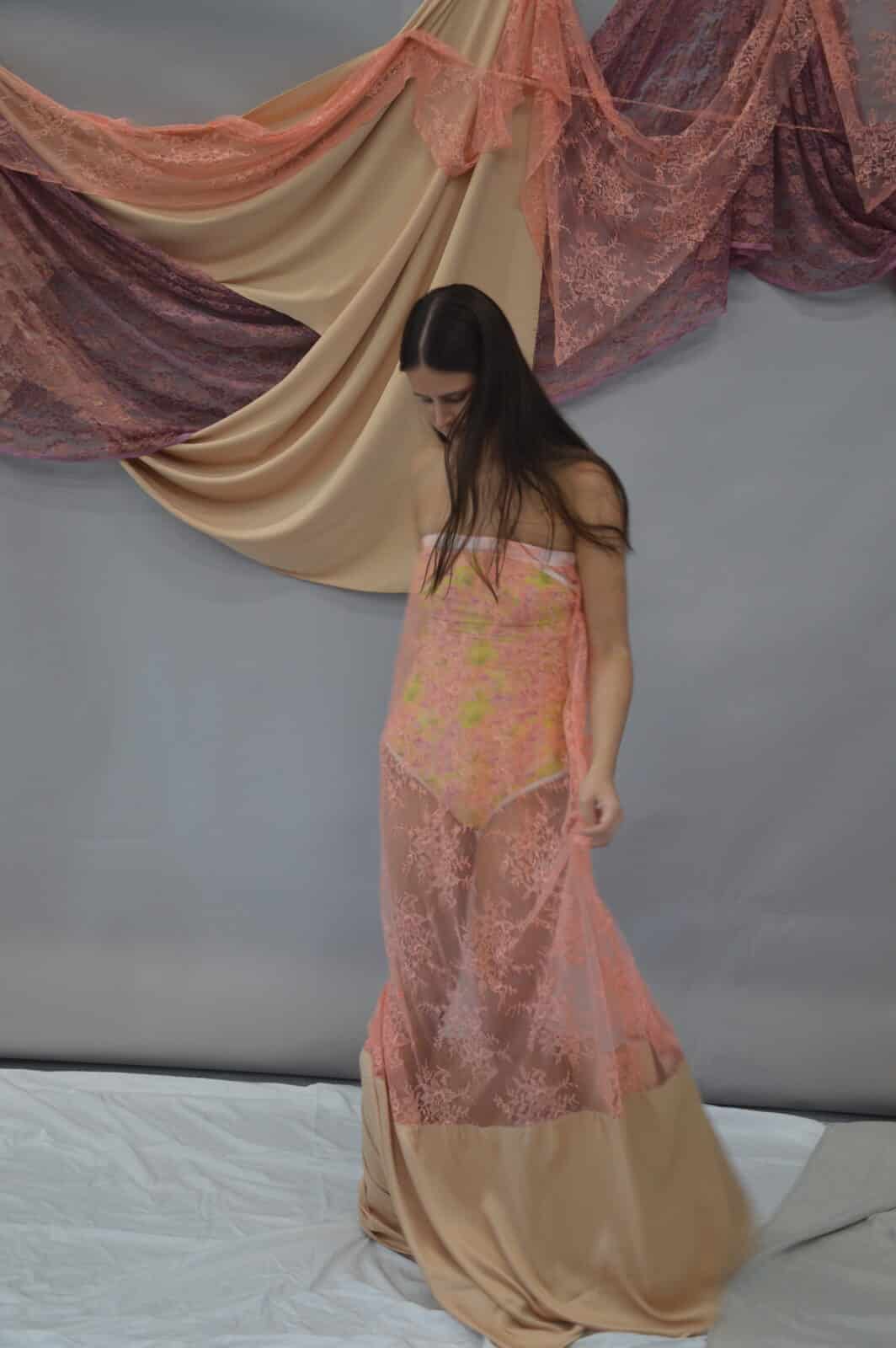 A printed lycra base forms a contemporary foundation, layered with delicate peach lace that introduces transparency and depth. Flowing satin panels anchor the look in grounded serenity, adding fluidity and movement.